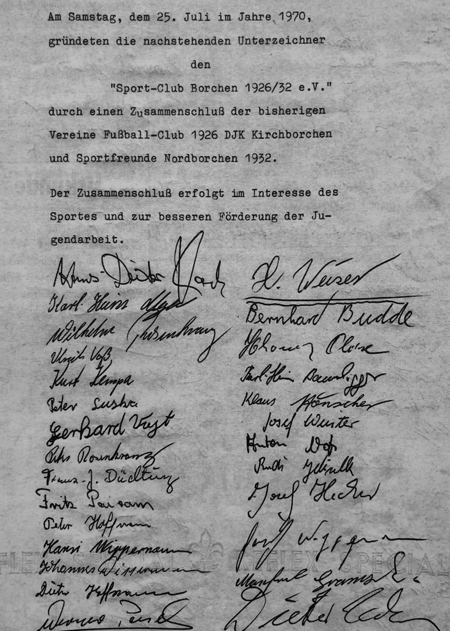 Am 25. Juli 1970 wurde durch den Zusammenschluss der bisherigen Vereine FC 1926 DJK Kirchborchen und Sportfreunde Nordborchenn1932 der SC Borchen 1926/32 e.V. gegründet.