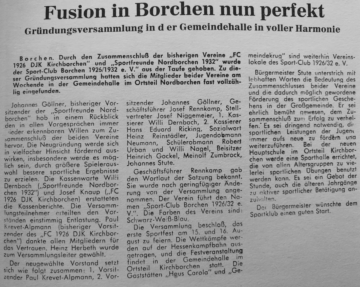 Lang, lang ist’s her! Doch schon ca. 20 Jahre zuvor wurde von der Tagespresse, am 15.9.1951, eine solche Fusion angeregt. Beide Vereine hatten zu diesem Zeitpunkt einen Tiefpunkt in ihrer Vereinshistorie erreicht, als beide den Spielbetrieb mit ihrer ersten Mannschaft eingestellt und in der Saison 1951/52 nur je eine Jugendmannschaft gemeldet hatten. Die Presse schrieb: "Es bleibt zu wünschen, dass in absehbarer Zeit sich beide Vereine zusammenschließen, um den Borchenern wieder eine starke Fußballelf zu geben." Diese Fusion unterblieb aber, weil beide Vereine ein Jahr später nach intensiven Bemühungen wieder eine Seniorenmannschaft stellen konnten.