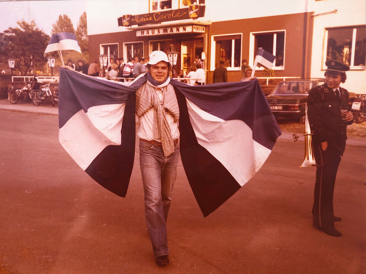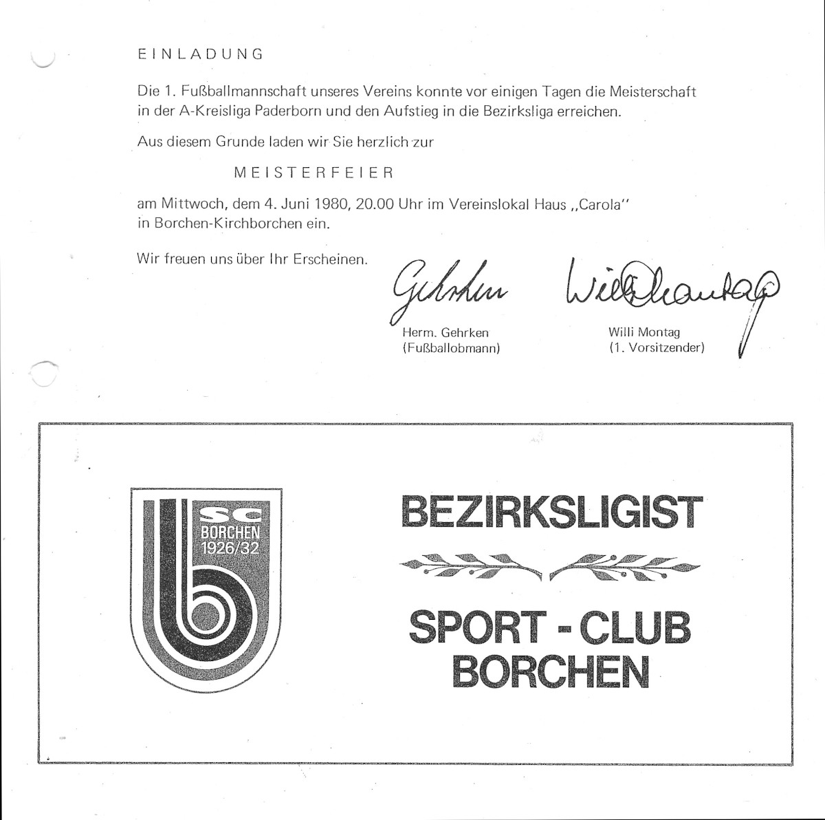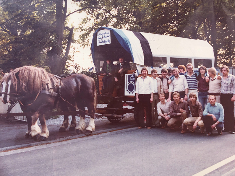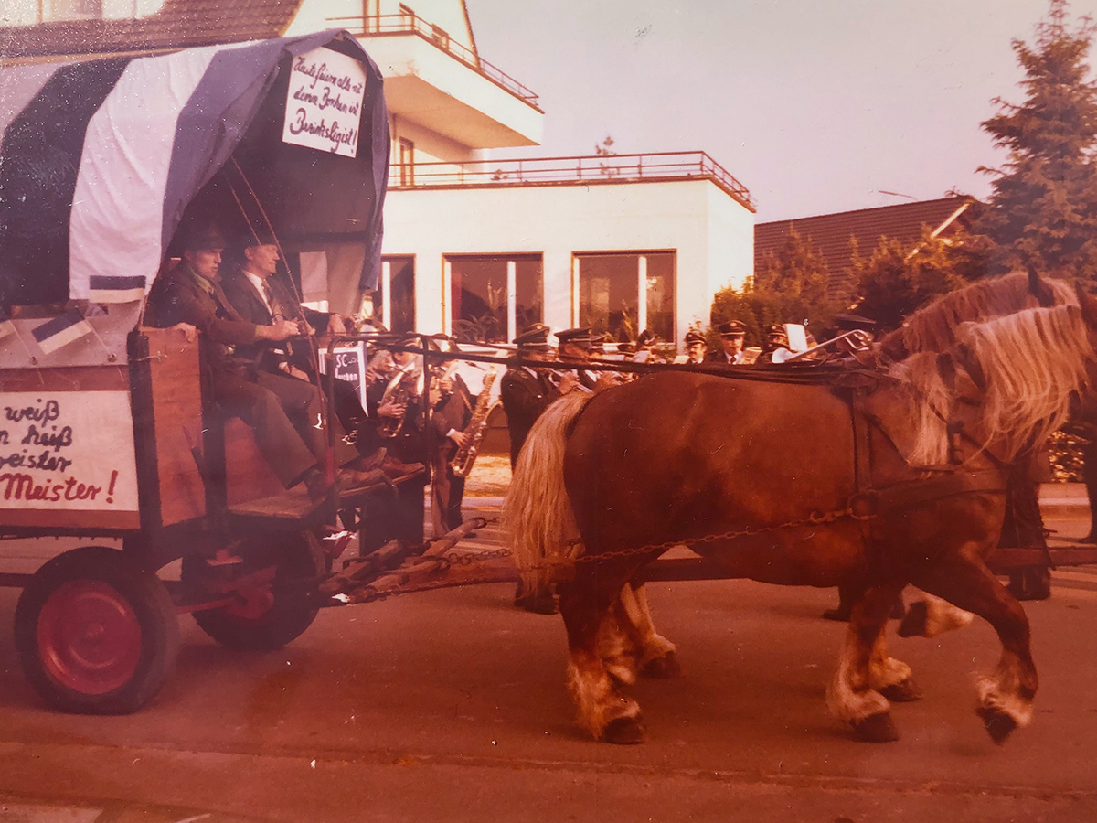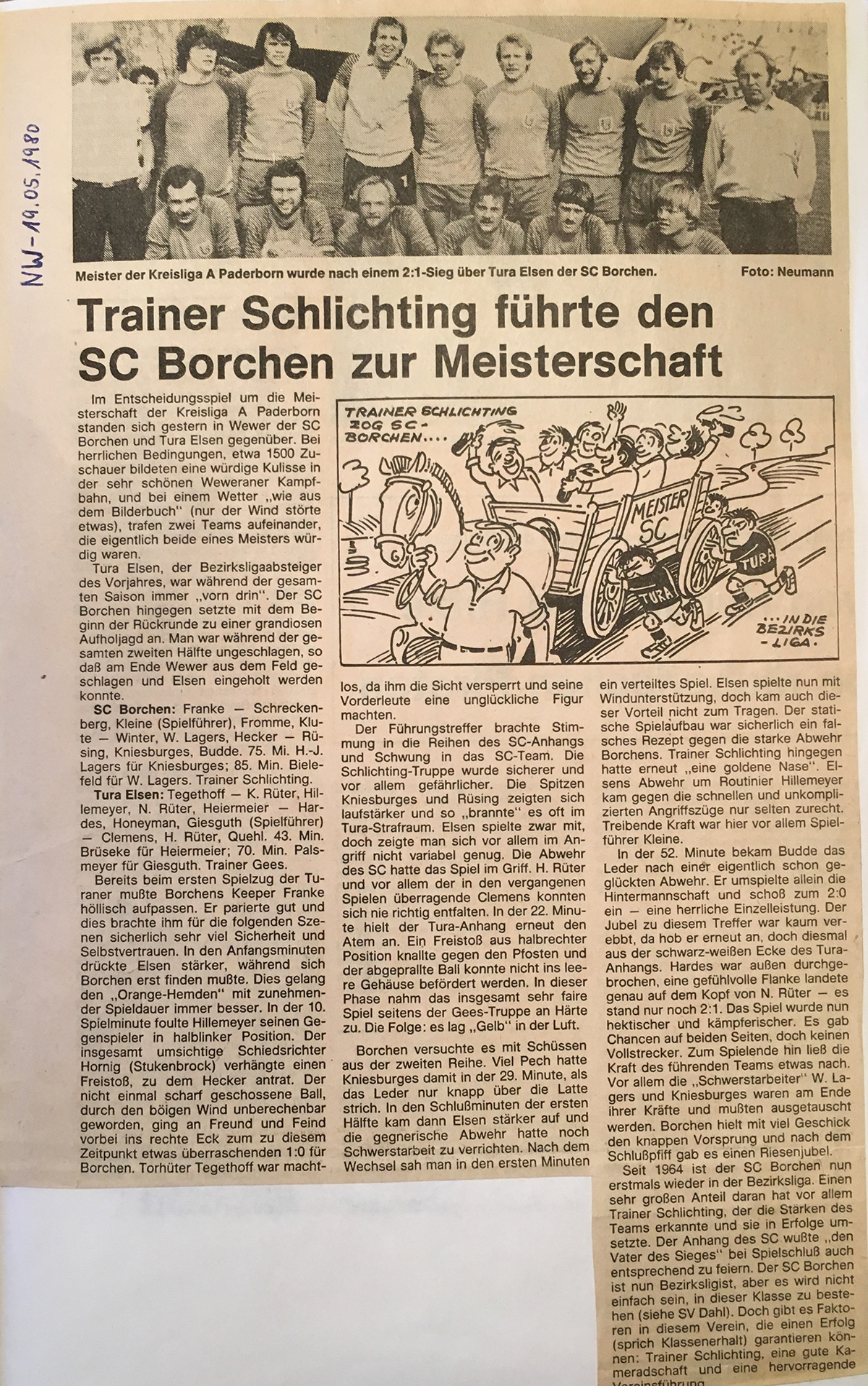 Nun zum Entscheidungsspiel an neutraler Stätte auf dem Sportplatz in Wewer. Bei Bilderbuchwetter und vor einer für uns unglaublichen und nie zu erwartenden Kulisse von 1.500 Zuschauern trafen wir auf den Bezirksligaabsteiger des Vorjahres, die TuRa aus Elsen. In der 10. Minute gingen wir durch einen Freistoß von Beppo Hecker, als Flanke gedacht, aber von dem unberechenbaren Wind begünstigt, mit 1:0 in Führung. In einem total ausgeglichenen Spiel erhöhte Bernhard Budde nach einem Alleingang mit toller Einzelleistung in der 52. Minute auf 2:0. Nur kurz darauf verkürzte N. Rüther per Kopf zum 2:1 für die TuRa. Das Spiel wogte nun hin und her, aber mit einer guten Defensivleistung aller, etwas Glück und der tollen Unterstützung der Zuschauer brachten wir den Vorsprung über die Zeit. Der Rest war nur noch Jubel und Freude pur, denn für alle war es die erste Meisterschaft und der erste Aufstieg im Seniorenbereich. An die darauf einsetzenden Feierlichkeiten, die gefühlt eine ganze Woche dauerten, wird sich sicherlich jeder der Protagonisten noch gerne erinnern. Hier alle Anekdoten zu erzählen, würde sicherlich zu weit führen. Aber im Gedächtnis haften geblieben, sind einmal die spontane ‚Meisterfeier‘ am Tag des Entscheidungsspiels im rappelvollen Gemeindekrug bei Willi Paulsen mit zahlreichen unserer Fans bis in den frühen Morgen, zum anderen die offizielle Feier eine Woche später bei Hausmann`s Peter im Haus Carola. Vor der zweiten Feier gab es für die Spieler noch eine Kutschwagenfahrt durch Borchen. Die beiden Pferdekutschen, die von Reinhard ‚Karo‘ Lohn und Franz Schäfers (Buer) zum Vereinslokal gelenkt wurden, waren von unserem Mannschaftsführer Heini Kleine vorher liebevoll geschmückt und mit gereimten Weisheiten zum Aufstieg plakatiert worden. Ein toller Auftakt zum Abschluss der Meisterfeier.