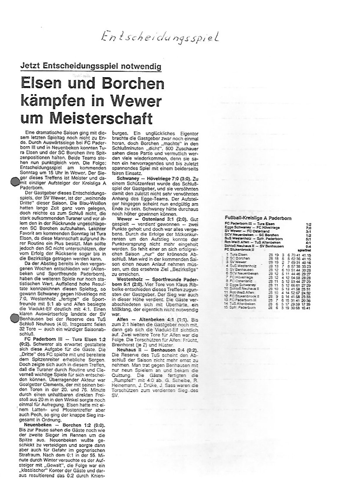 Auch in diesem Jahr war die Kreisliga A, vom Spielniveau vielleicht mit der heutigen Bezirksliga vergleichbar, gut besetzt. Wenn auch der SV Wewer und TuRa Elsen allgemein als Favoriten gehandelt wurden, war mit unserem neuen Trainer Manfred Schlichting unser aller erklärtes Ziel nur der Aufstieg. Der Start und die Hinrunde verliefen aber noch nicht so rund und erfolgreich, wie der Trainer und unsere Mannschaft sich das vorgestellt hatten. Wir waren zwar in der Spitzengruppe dabei, aber eben nicht an der Spitze, sondern hinter den erklärten Favoriten Elsen und Wewer. Die Unzufriedenheit unseres Coaches wurde uns Spielern vor dem schweren Spiel in Ostenland mehr als deutlich gemacht, indem er uns klar machte, dass er bei einer Niederlage seinen Posten zur Verfügung stellen werde. Ich weiß bis heute nicht, ob Manni das in die Tat umgesetzt hätte oder er uns aus Motivationsgründen nur „kitzeln“ wollte. Das Auswärtsspiel wurde auf jeden Fall mit 2:0 gewonnen und es ging in den nächsten Wochen spielerisch bergauf. Dennoch betrug unser Rückstand auf den Tabellenführer Wewer zu Beginn der Rückrunde satte acht Punkte, bei der damaligen 2-Punkte-Regel eigentlich ein fast aussichtsloses Unterfangen. Die Rückrunde wurde dann aber zu einer wohl einmaligen Aufholjagd, kein Spiel ging mehr verloren, Punkt um Punkt wurde gut gemacht und wir mussten uns nur zweimal mit einem Unentschieden begnügen. Die beiden richtungsweisenden, entscheidenden Spiele waren dabei die gegen die Hauptkonkurrenten Elsen und Wewer. Im Heimspiel gegen die TuRa aus Elsen lagen wir zwischenzeitlich mit 0:2 und 1:3 fast aussichtslos zurück, so dass sich einige enttäuschte Zuschauer schon auf den Heimweg machten. Der Jubel beim 2:3 und 3:3 ließ sie aber schnell zurückkehren, so dass die den 4:3-Sieg mitfeiern konnten. Wahrscheinlich war dieser Sieg, besonders nach den zwischenzeitlichen Rückständen der ‚Knackpunkt‘, die entscheidende Wende und der letzte Motivationsschub im Aufstiegsrennen. Denn das Spiel gegen die lange die Tabelle anführenden Weweraner konnten wir relativ souverän mit 3:0 für uns entscheiden. Im letzten gewonnenen Saisonspiel in Neuenbeken gelang es dann, die Elsener einzuholen, so dass bei Punktgleichheit ein Entscheidungsspiel notwendig wurde.